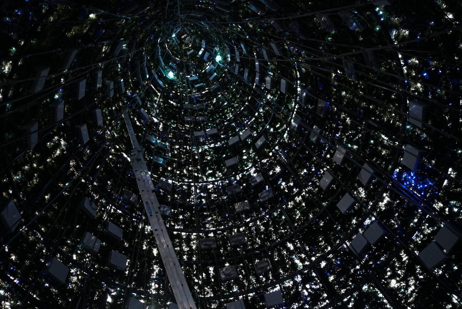 We designed and built a 20-metre steel-framed tree embedded with over 100,000 LEDs, hand-stitched into an exact grid pattern. For the lighting, we used 14 pixelators and programmed with animated sequences, all controlled via a 2×2 Disguise media servers.