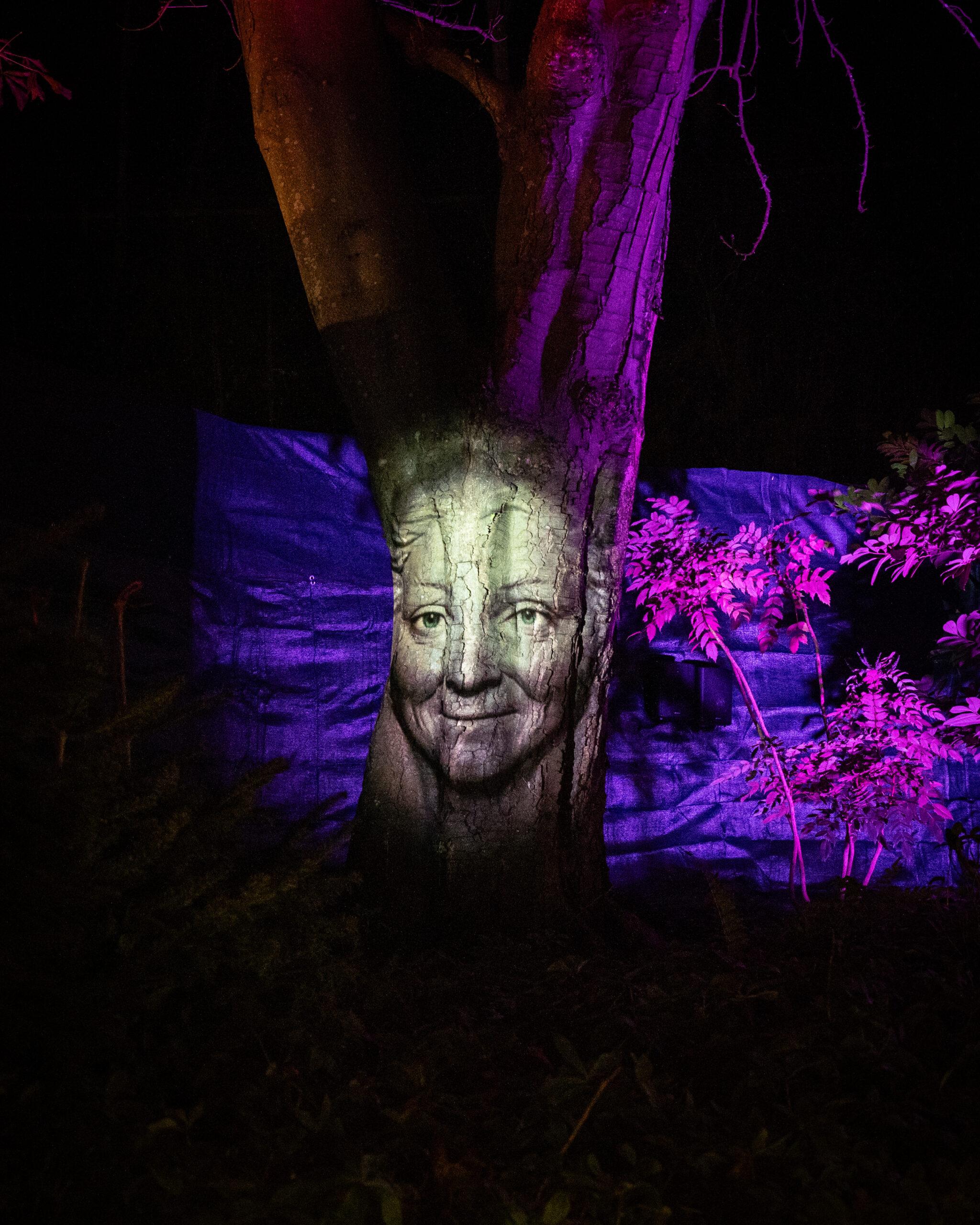 A shimmering pathway lined with dancing fairy holograms created using 12 x 65cm holofans. These characters appear to flit between the trees, gilding guests deeper into the illuminated world.