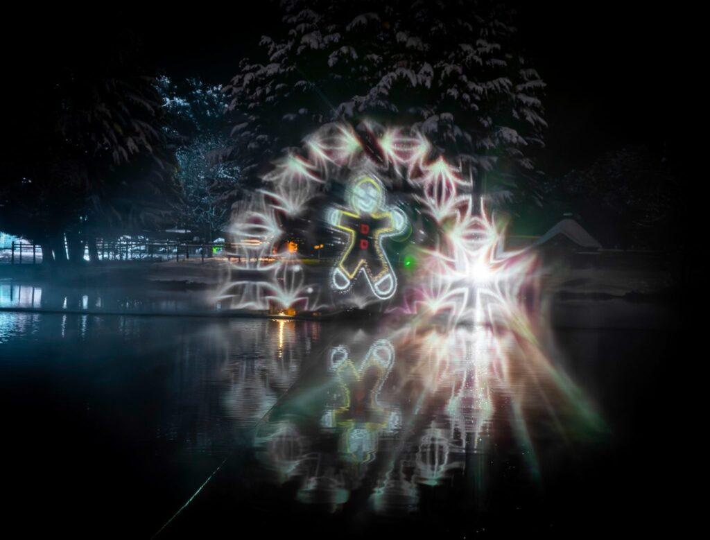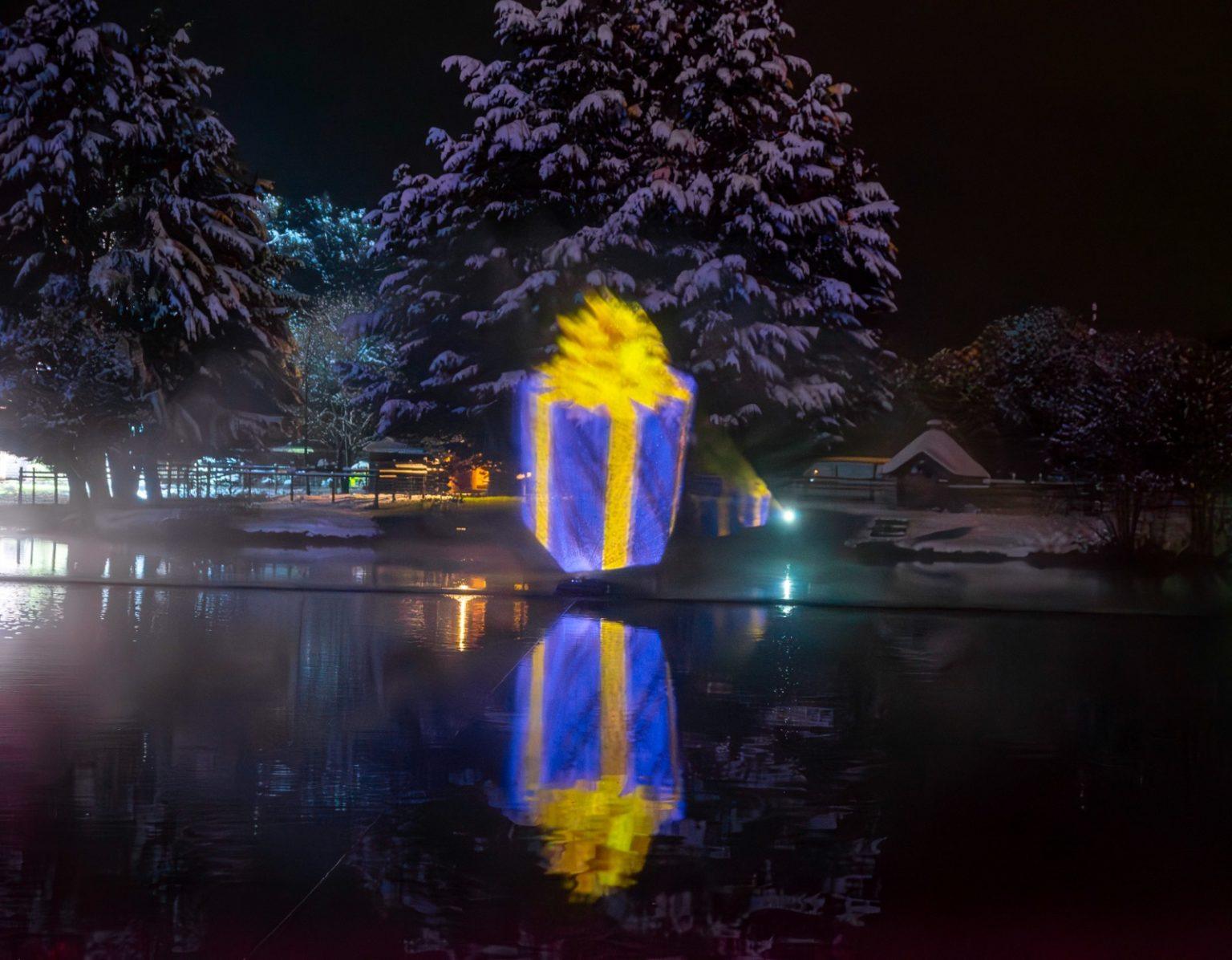 This included the standout water screen projection show on the lake in Reindeer Land. This mesmerising display includes festive scenes such as Father Christmas sweeping in on his sleigh, dancing gingerbread men and animated reindeer in a 3 minute show. We designed and delivered the full projection-mapped show. From specifying and installing the physical water screen. To creating original content that brings these moments to life and seamlessly integrates with the Christmas atmosphere.